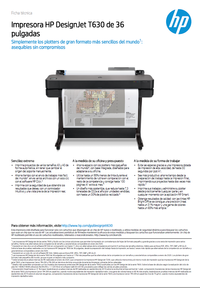 Contenido de la caja | Impresora HP DesignJet T630 de 36 pulgadas, soporte de impresora, alimentador automático de hojas, cabezal de impresión, cartuchos de tinta de inicio, eje, guía de referencia rápida, póster de instalación, cable de alimentación |